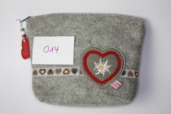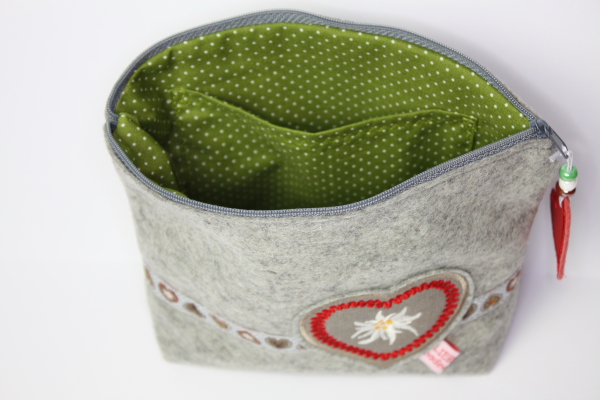 In diese Tasche geht richtig was rein, deshalb ist sie unverzichtbar auf Reisen. Jeglicher Kleinkram findet darin Platz und ist somit im Koffer oder Reisetasche gut verstaut. Die Tasche sieht durch das Edelweißherz besonders edel aus. Innen ist sie mit einem Baumwollstoff ausgekleidet und hat eine Innentasche.