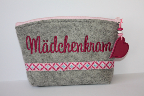 Hier passt so einiges rein! Die Kosmetiktasche ist aus hochwertigen Wollfilz, innen mit Baumwollpopeline passend zum Webband. Auch für sehr große Mädchen geeignet!