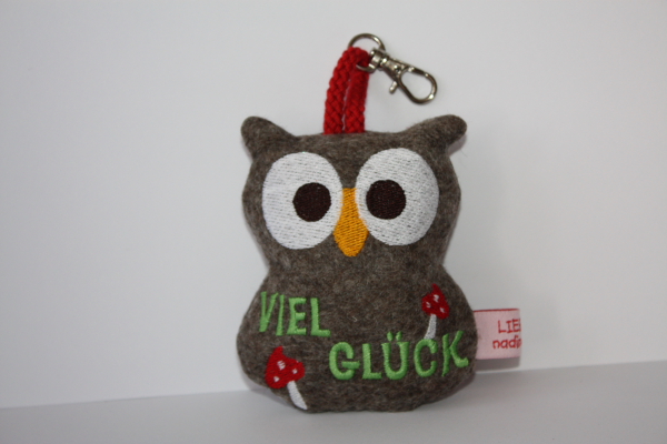 Dieser süße Eulenanhänger ist aus Wollfilz und kann an eine Tasche gehängt werden. Er bringt hoffentlich ganz viel Glück!